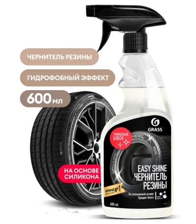 Полироль чернитель шин "Easy shine" (флакон 600 мл) Профессиональное средство на силиконовой основе для очистки и полировки шин, а также других резиновых деталей автомобиля. Восстанавливает черный цвет, обновляет поверхность, придает глянцевый блеск. Не допускает проникновения воды, тем самым предохраняя от коррозии и быстрого старения. Зимой можно использовать для защиты уплотнителей дверей и капота багажника от примерзания.Состав