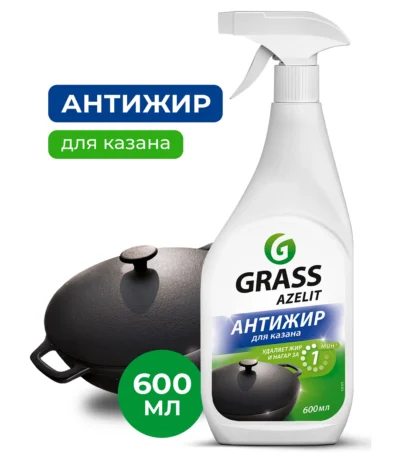 Бытовая химия Grass (ГраСС) Чистящее средство для кухни Azelit казан  600 мл. Средство Азелит АНТИЖИР КАЗАН для удаления жира, нагара и копоти с казанов, со сковородок, кухонных плит, коптильных камер, фритюрниц, грилей, духовых шкафов, микроволновых печей и др. Содержит активные чистящие вещества, которые помогают максимально эффективно справиться с застарелыми загрязнениями.Нанести на очищаемую поверхность, оставить не более чем на 30 секунд, в зависимости от загрязнения можно увеличить время экспозиции до 2 минут.