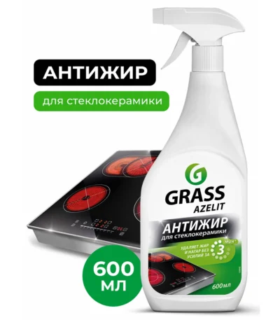 Бытовая химия Grass (ГраСС). Чистящее средство для  стеклокерамики, индукционных и керамических плит от компании GRASS (ГРАСС). Средство АНТИЖИР AZELIT спрей удаляет жир, придает блеск и защищает от повторного загрязнения. В состав включены компоненты, обеспечивающие быстрое удаление сложных загрязнений, таких как пригоревшие остатки пищи. Чистящее средство для кухни равномерно распределяется по варочной панели и легко смывается без разводов, чтобы повысить эффективность ухода, рекомендуется оставить на обрабатываемом участке на несколько минут, а затем удалить посредством губки или мягкой тканевой салфетки без ворса. Уборка любых блестящих поверхностей до блеска с azelit антижир для стеклокерамики.