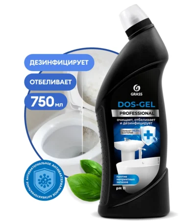Универсальное чистящее средство DOS-GEL на основе активного хлора для мытья, дезинфекциии отбеливания. Идеально подходит для чистки унитазов, ванн, раковин, кафеля, стоков, сливов, пола и рабочих поверхностей. Обладает дезинфицирующими свойствами, удаляет плесень и грибок. Густая формула позволяет средству дольше оставаться на стенках, продолжая работать.