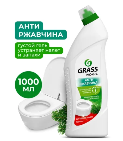 WC- Gel 1л. Средства для уборки от GRASS (ГРАСС). Чистящее средство для ванной, кухни, туалета (гель для унитаза, туалета), фаянсовых изделий, кафеля от известкового налета, потеков ржавчины, солевых отложений.Универсальное чистящее средство для уборки подходит для чистки фаянсовых изделий на кухне и ванной комнаты. Способствует устранению неприятного запаха, убивает микробы. Гелевая формула  обеспечивает его экономичный расход. Не держать на хромированных деталях более 30 секунд. Способ применения: средство нанести на очищаемую поверхность, оставить на 1-2 минуты. Потереть щеткой или губкой, смыть водой. При необходимости повторить обработку. »