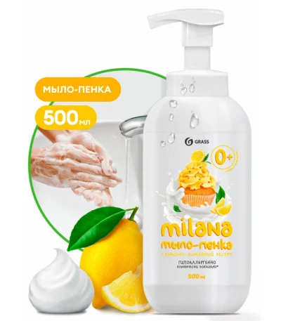одним нажатием дозатора выдавить пенку на ладони, тщательно намылить руки и смыть водой.Жидкое мыло «Milana мыло-пенка сливочно-лимонный десерт» (флакон 500 мл)
