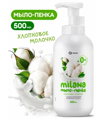 Способ применения: одним нажатием дозатора выдавить пенку на ладони, тщательно намылить руки и смыть водой.Мыло-пенка «Milana» Хлопковое молочко (флакон 500 мл)