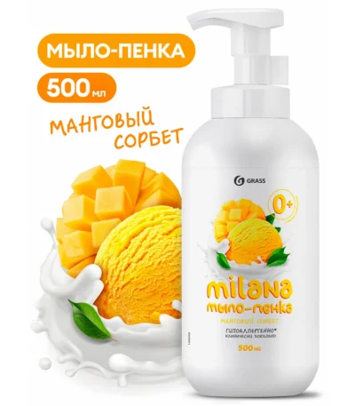 Способ применения: одним нажатием дозатора выдавить пенку на ладони, тщательно намылить руки и смыть водой.Мыло-пенка «Milana» Манговый сорбет (флакон 500 мл)