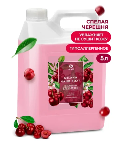 нанести небольшое количество мыла на кожу, добиться образования пены и смыть водой. Используется в дозаторах жидкого мыла.Крем-мыло жидкое увлажняющее «Milana спелая черешня» (канистра 5 кг)