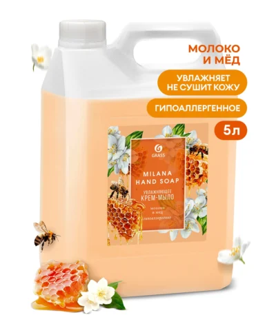 нанести небольшое количество мыла на кожу, добиться образования пены и смыть водой. Используется в дозаторах жидкого мыла.Крем-мыло жидкое увлажняющее «Milana молоко и мед» (канистра 5 кг)